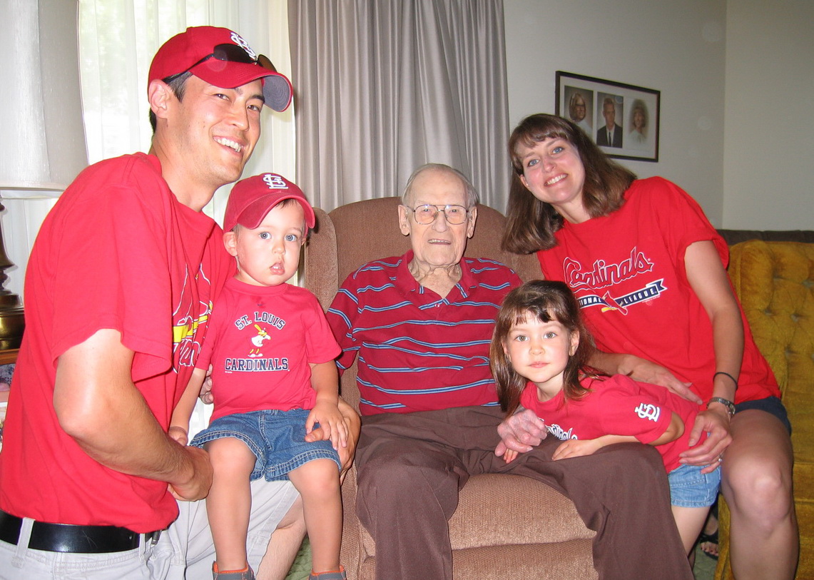 On Wednesday afternoon, we loaded the kids in the car again and drove to St. Louis to see my grandpa. He has been a bit under the weather this year, but I really believe he perked up and was glad to see us and the kids. He got a kick out of just watching them run around his house. We took him out to eat for supper and made it back in time to watch the Cardinals on TV...a favorite pastime of his.